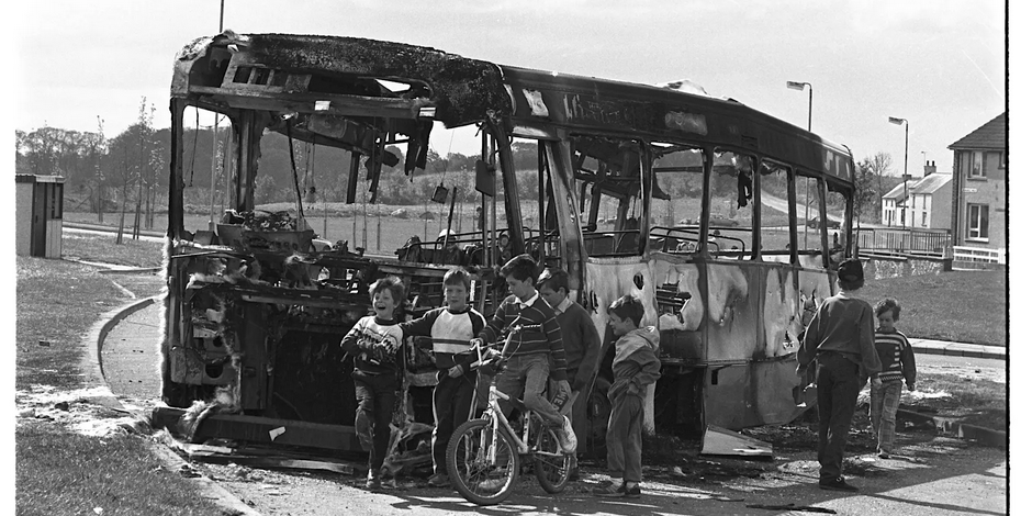 Image credit: The burning bus was taken in Downpatrick in the 1980s and is part of the Bobbie Hanvey collection in Boston College, MS2001_039_885.