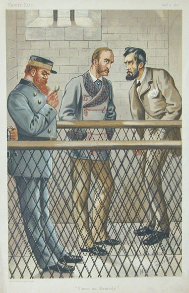 Image: “Force no Remedy” (Charles Stewart Parnell; John Dillon and an unknown policeman) by Harry Furniss chromolithograph, published in Vanity Fair 7 December 1881